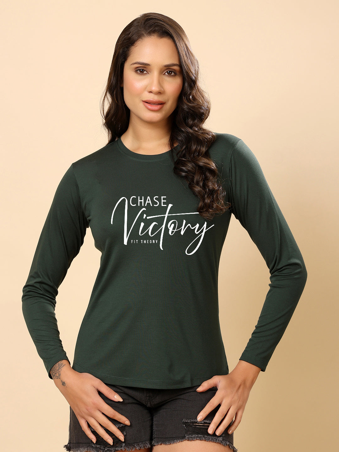 Women Printed Full Sleeves T-shirt-Bottle Green Chase Victory